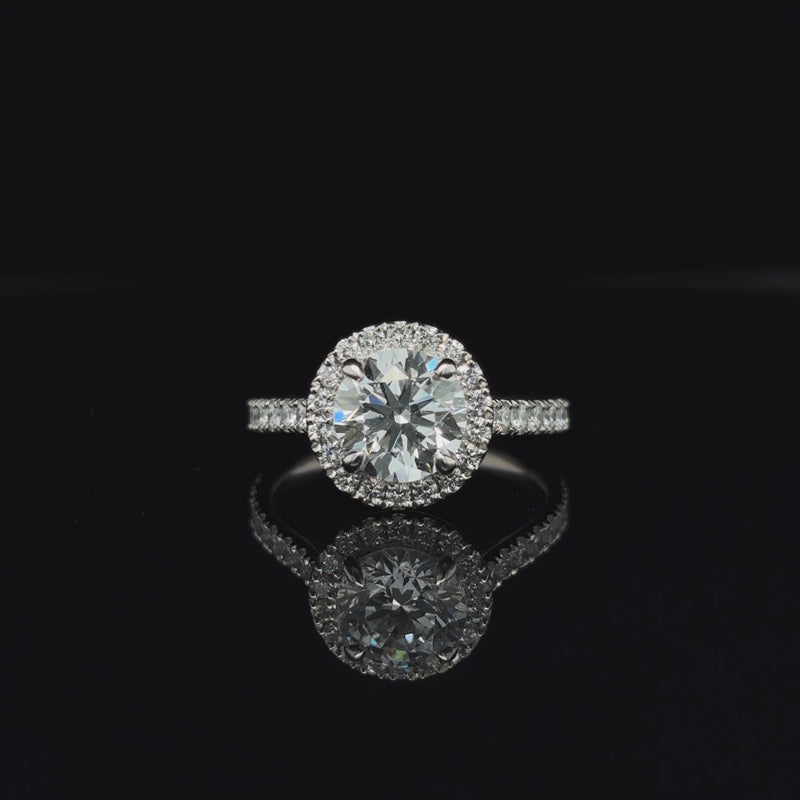 This Platinum Round Halo Lab Diamond Engagement Ring exudes timeless elegance and expert craftsmanship. The centre stone is a 1.52ct Round Brilliant lab diamond, graded D Colour and VVS2 Clarity, elegantly framed by a halo of pavé-set diamonds, bringing the total lab diamond weight to 2.09cts and enhancing the ring’s radiance.