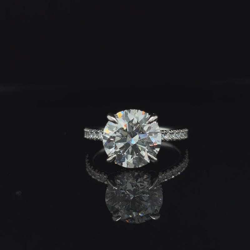 This Platinum Round Lab Diamond Engagement Ring exudes modern elegance and exceptional craftsmanship. The centre stone is a 4.04ct Round Brilliant lab diamond, graded F Colour and VVS2 Clarity, complemented by a pavé-set band, bringing the total lab diamond weight to 4.54cts for an extraordinary brilliance.